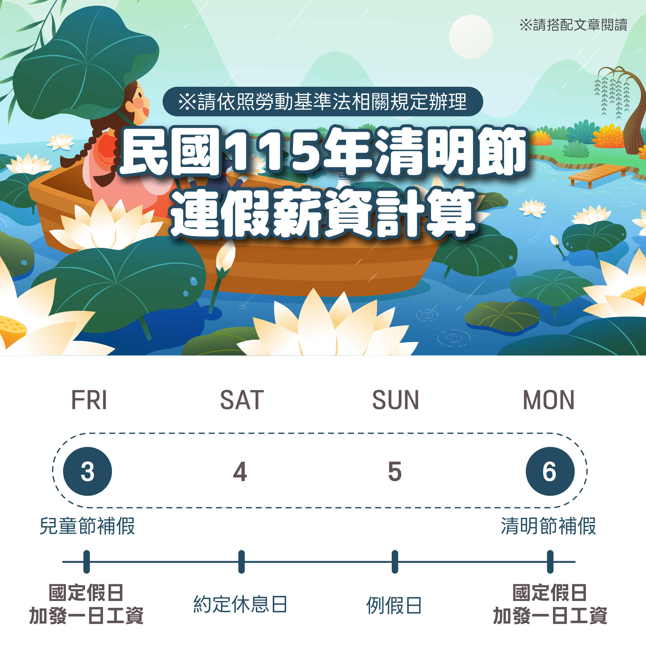 民國115年(2026年)兒童節與清明節連假期間,於一般約定週一至週五為工作日、週六為休息日、週日為例假日之出勤模式下,將同時涉及國定假日、補假日、休息日及例假日等不同日別之交錯適用。本文擬就民國115年清明節連假期間,各類假日之法律性質及其工資計算方式,分別加以說明。[1][2]